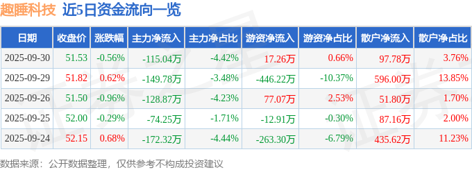 9月30日的资金流向数据方面,主力资金净流出115.04万元,占总成交额4.42%,游资资金净流入17.26万元,占总成交额0.66%,散户资金净流入97.78万元,占总成交额3.76%。