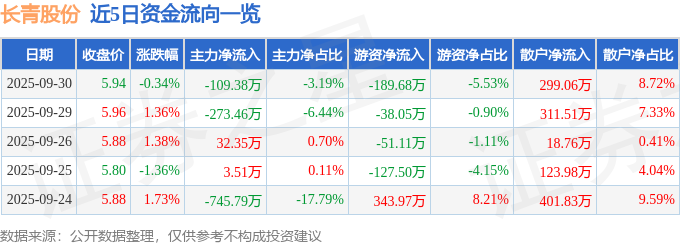 证券之星消息,截至2025年9月30日收盘,长青股份(002391)报收于5.94元,下跌0.34%,换手率1.24%,成交量5.74万手,成交额3428.37万元。