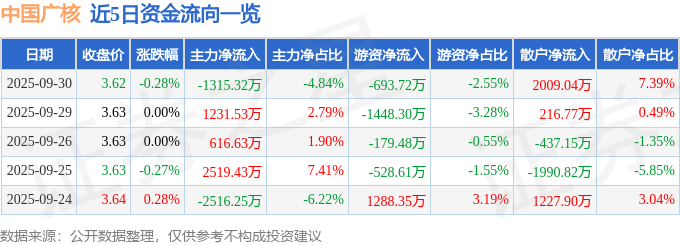 证券之星消息,截至2025年9月30日收盘,中国广核(003816)报收于3.62元,下跌0.28%,换手率0.19%,成交量75.27万手,成交额2.72亿元。