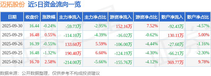 证券之星消息,截至2025年9月30日收盘,迈拓股份(301006)报收于16.44元,下跌0.24%,换手率1.43%,成交量1.23万手,成交额2022.67万元。