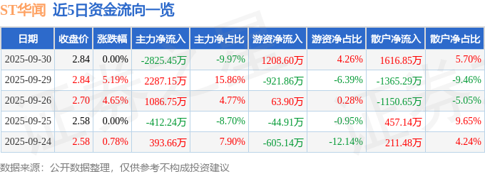 9月30日的资金流向数据方面,主力资金净流出2825.45万元,占总成交额9.97%,游资资金净流入1208.6万元,占总成交额4.26%,散户资金净流入1616.85万元,占总成交额5.7%。