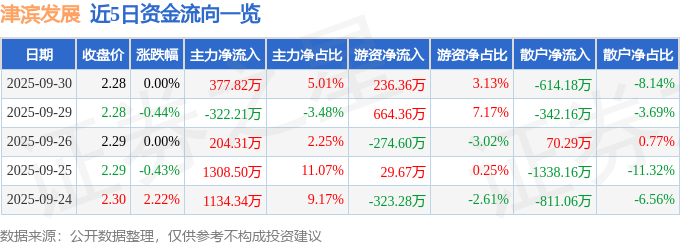 证券之星消息,截至2025年9月30日收盘,津滨发展(000897)报收于2.28元,上涨0.0%,换手率2.04%,成交量33.04万手,成交额7545.72万元。