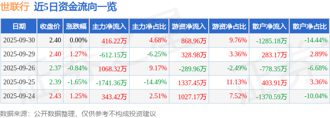 证券之星消息,截至2025年9月30日收盘,世联行(002285)报收于2.4元,上涨0.0%,换手率1.88%,成交量37.11万手,成交额8900.68万元。