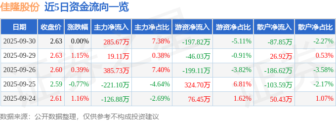 证券之星消息,截至2025年9月30日收盘,佳隆股份(002495)报收于2.63元,上涨0.0%,换手率2.1%,成交量14.7万手,成交额3872.24万元。