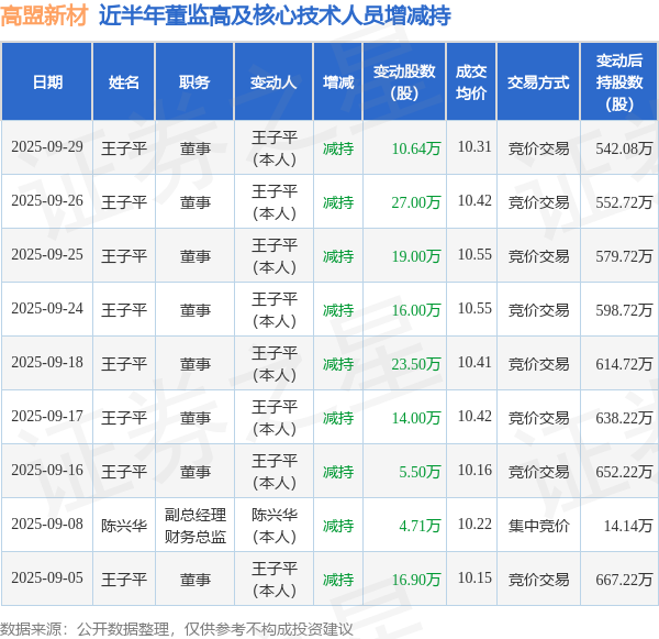 高盟新材近半年内的董监高及核心技术人员增减持详情如下: