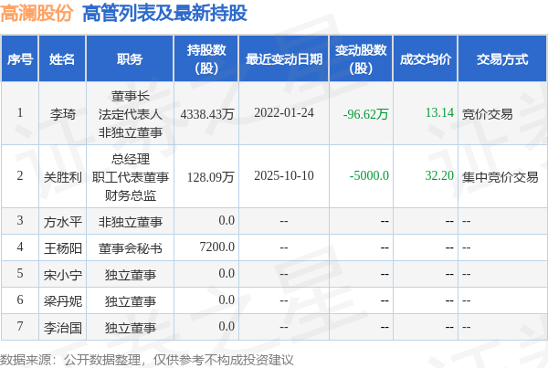 高澜股份的高管列表及最新持股情况如下: