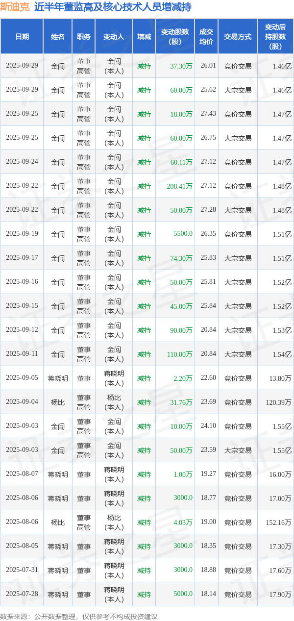 斯迪克近半年内的董监高及核心技术人员增减持详情如下: