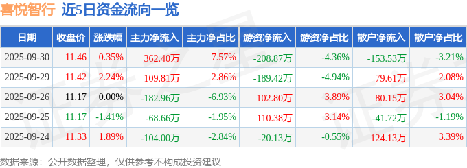 证券之星消息,截至2025年9月30日收盘,喜悦智行(301198)报收于11.46元,上涨0.35%,换手率2.67%,成交量4.16万手,成交额4785.65万元。
