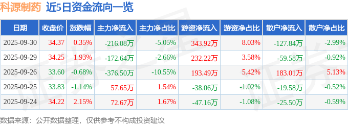 证券之星消息,截至2025年9月30日收盘,科源制药(301281)报收于34.37元,上涨0.35%,换手率1.82%,成交量1.25万手,成交额4280.61万元。