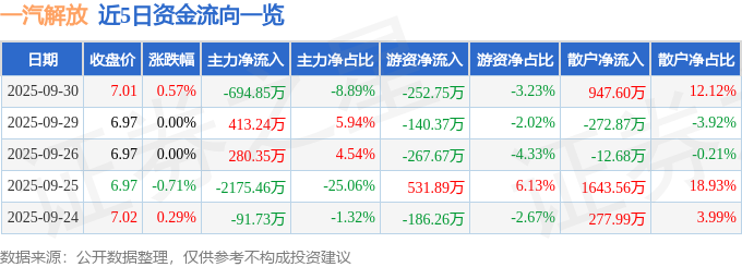 证券之星消息,截至2025年9月30日收盘,一汽解放(000800)报收于7.01元,上涨0.57%,换手率0.23%,成交量11.19万手,成交额7815.84万元。