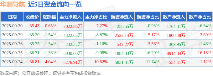 证券之星消息,截至2025年9月30日收盘,华测导航(300627)报收于35.43元,上涨0.65%,换手率1.22%,成交量7.87万手,成交额2.78亿元。