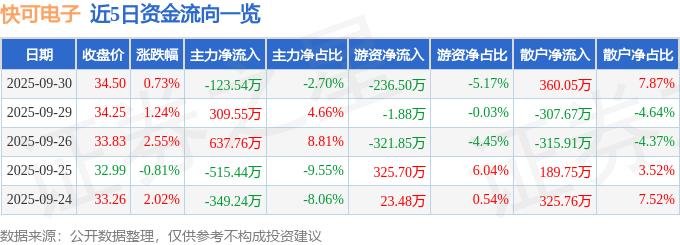 证券之星消息,截至2025年9月30日收盘,快可电子(301278)报收于34.5元,上涨0.73%,换手率2.94%,成交量1.32万手,成交额4577.17万元。