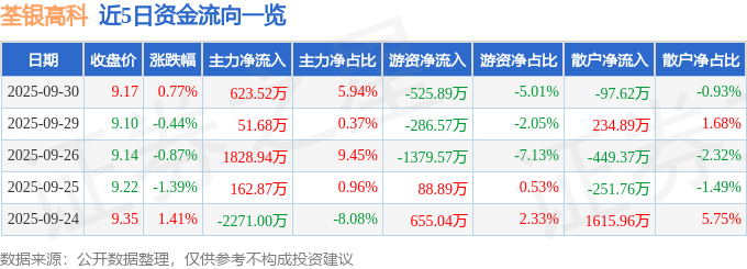 证券之星消息,截至2025年9月30日收盘,荃银高科(300087)报收于9.17元,上涨0.77%,换手率1.29%,成交量11.52万手,成交额1.05亿元。