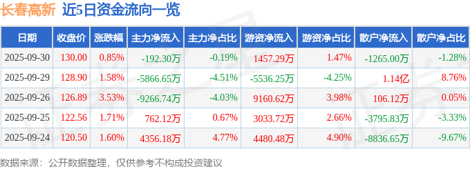 证券之星消息,截至2025年9月30日收盘,长春高新(000661)报收于130.0元,上涨0.85%,换手率1.91%,成交量7.64万手,成交额9.91亿元。