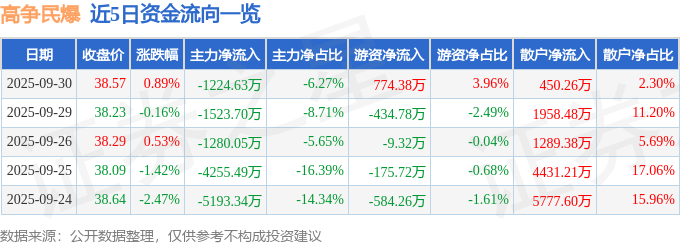 证券之星消息,截至2025年9月30日收盘,高争民爆(002827)报收于38.57元,上涨0.89%,换手率1.84%,成交量5.09万手,成交额1.95亿元。