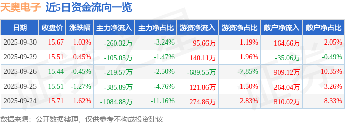证券之星消息,截至2025年9月30日收盘,天奥电子(002935)报收于15.67元,上涨1.03%,换手率1.23%,成交量5.12万手,成交额8025.1万元。