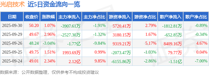 证券之星消息,截至2025年9月30日收盘,光启技术(002625)报收于50.2元,上涨1.07%,换手率1.89%,成交量40.69万手,成交额20.47亿元。