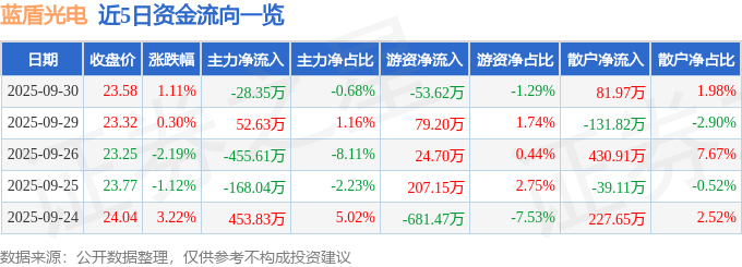 9月30日的资金流向数据方面,主力资金净流出28.35万元,占总成交额0.68%,游资资金净流出53.62万元,占总成交额1.29%,散户资金净流入81.97万元,占总成交额1.98%。
