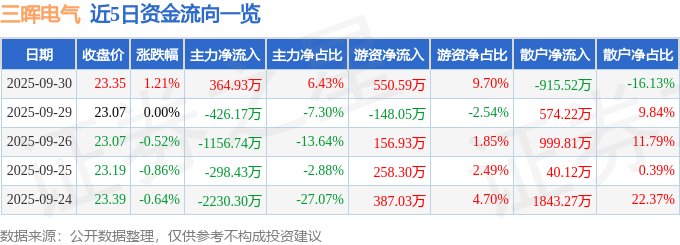 证券之星消息,截至2025年9月30日收盘,三晖电气(002857)报收于23.35元,上涨1.21%,换手率1.9%,成交量2.43万手,成交额5675.68万元。