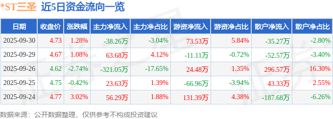证券之星消息,截至2025年9月30日收盘,*ST三圣(002742)报收于4.73元,上涨1.28%,换手率0.62%,成交量2.66万手,成交额1259.43万元。