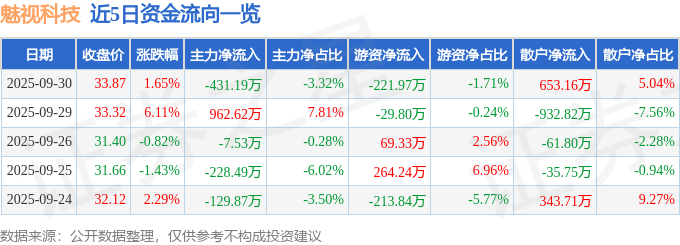 证券之星消息,截至2025年9月30日收盘,魅视科技(001229)报收于33.87元,上涨1.65%,换手率7.15%,成交量3.77万手,成交额1.3亿元。