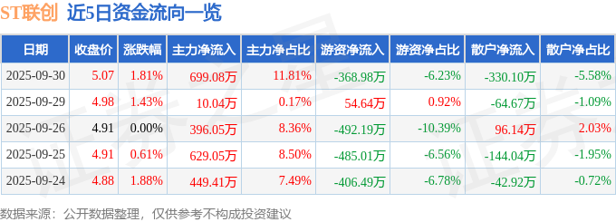 证券之星消息,截至2025年9月30日收盘,ST联创(300343)报收于5.07元,上涨1.81%,换手率1.1%,成交量11.7万手,成交额5918.01万元。