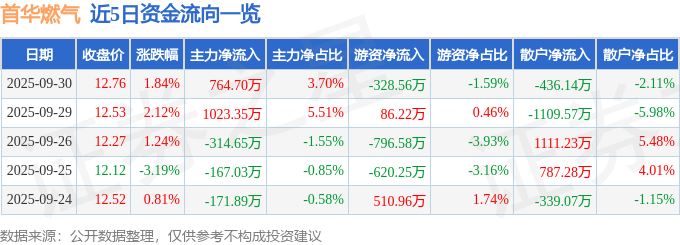 证券之星消息,截至2025年9月30日收盘,首华燃气(300483)报收于12.76元,上涨1.84%,换手率6.01%,成交量16.34万手,成交额2.07亿元。