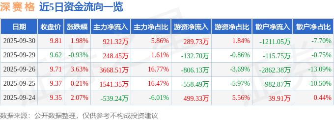 证券之星消息,截至2025年9月30日收盘,深 赛 格(000058)报收于9.81元,上涨1.98%,换手率1.63%,成交量16.02万手,成交额1.57亿元。