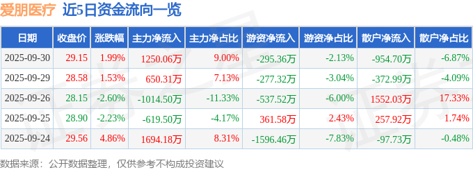 证券之星消息,截至2025年9月30日收盘,爱朋医疗(300753)报收于29.15元,上涨1.99%,换手率5.43%,成交量4.77万手,成交额1.39亿元。