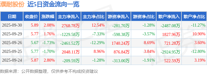 证券之星消息,截至2025年9月30日收盘,濮耐股份(002225)报收于5.89元,上涨2.08%,换手率3.82%,成交量37.19万手,成交额2.21亿元。