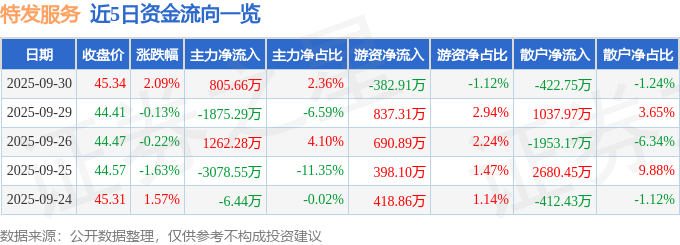 证券之星消息,截至2025年9月30日收盘,特发服务(300917)报收于45.34元,上涨2.09%,换手率4.45%,成交量7.52万手,成交额3.42亿元。