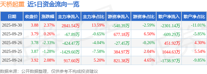 证券之星消息,截至2025年9月30日收盘,天桥起重(002523)报收于3.88元,上涨2.37%,换手率3.8%,成交量53.66万手,成交额2.09亿元。