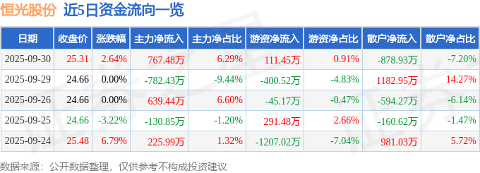 证券之星消息,截至2025年9月30日收盘,恒光股份(301118)报收于25.31元,上涨2.64%,换手率4.62%,成交量4.85万手,成交额1.22亿元。