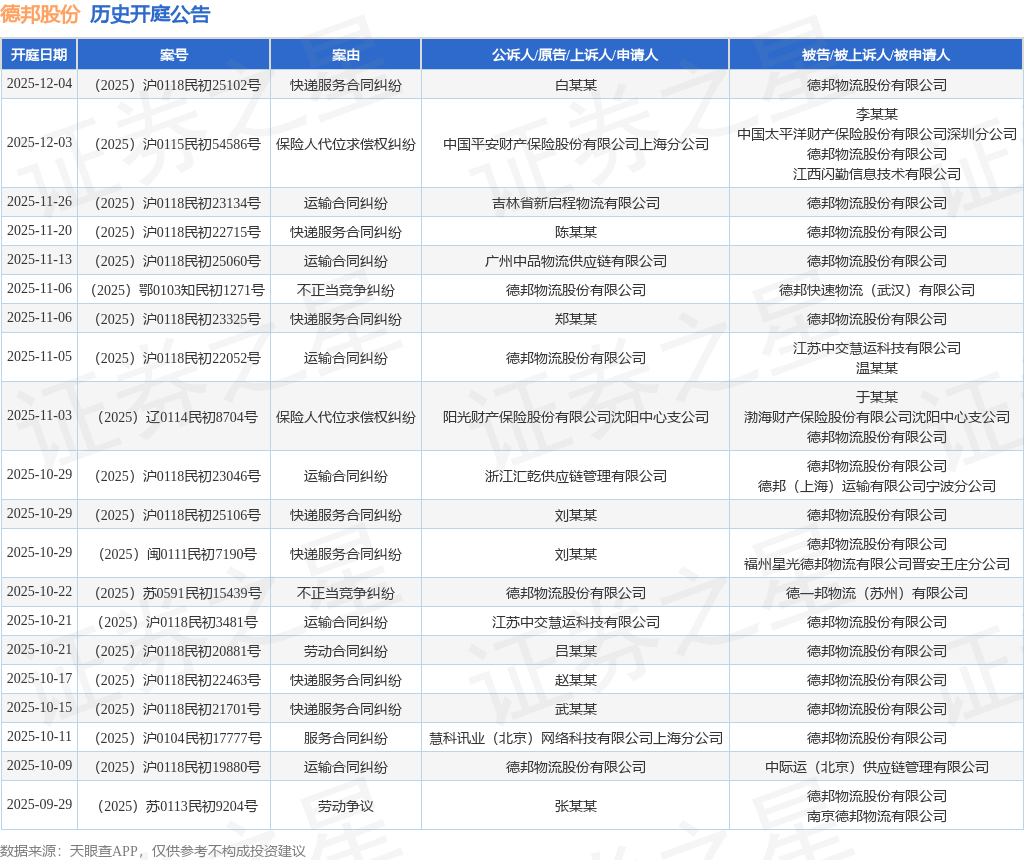 案号:(2025)沪0118民初19880号根据统计,近一年内以德邦物流股份有限公司为当事人的历史开庭公告有402则,其中案由为“快递服务合同纠纷”的公告以131则居首,其次为“运输合同纠纷”有79则,“劳动争议”有28则。历史开庭公告(前20条)如下: