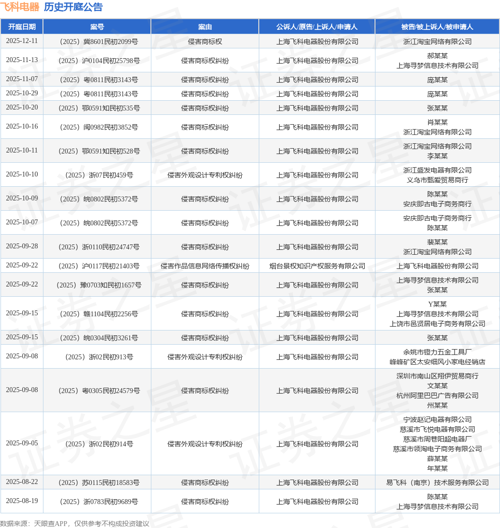 案号:(2025)皖0802民初5372号根据统计,近一年内以上海飞科电器股份有限公司为当事人的历史开庭公告有310则,其中案由为“侵害商标权纠纷”的公告以241则居首,其次为“不正当竞争纠纷”有17则,“侵害外观设计专利权纠纷”有15则。历史开庭公告(前20条)如下: