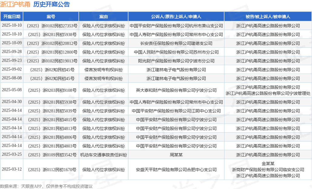 案号:(2025)浙0102民初20812号根据统计,近一年内以浙江沪杭甬高速公路股份有限公司为当事人的历史开庭公告有16则,其中案由为“保险人代位求偿权纠纷”的公告以13则居首,其次为“侵害发明专利权纠纷”有2则,“机动车交通事故责任纠纷”有1则。历史开庭公告如下: