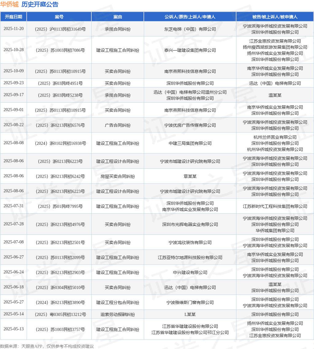 案号:(2025)苏0113民初10915号根据统计,近一年内以深圳华侨城股份有限公司为当事人的历史开庭公告有65则,其中案由为“买卖合同纠纷”的公告以21则居首,其次为“建设工程施工合同纠纷”有21则,“承揽合同纠纷”有6则。历史开庭公告(前20条)如下: