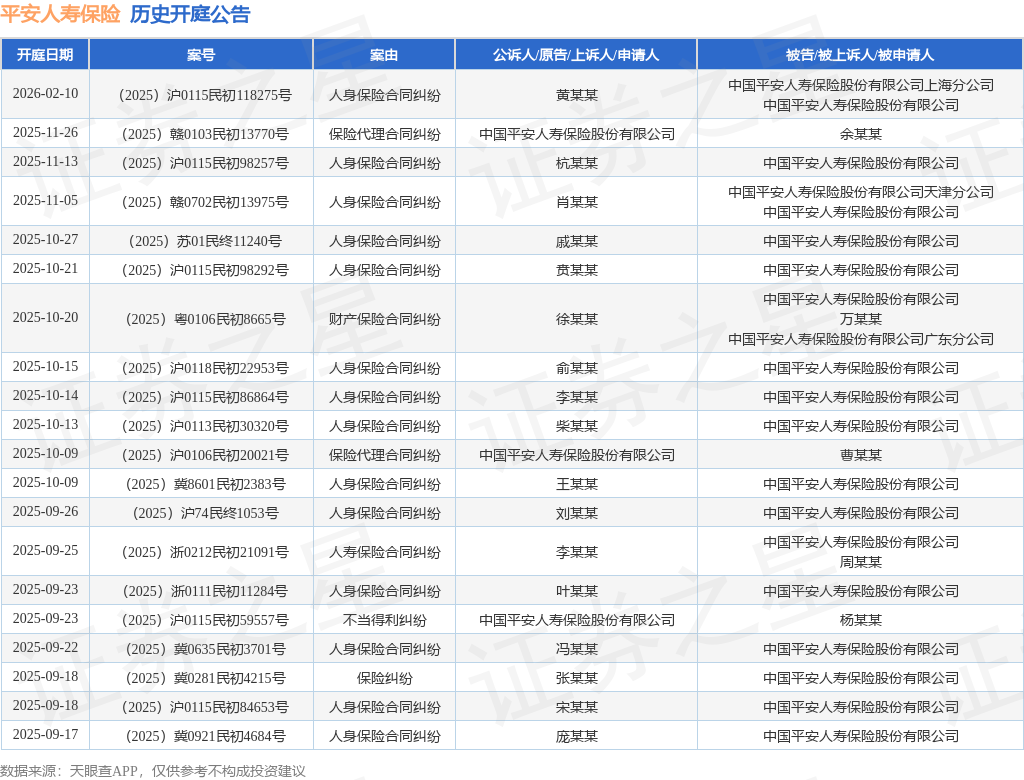 案号:(2025)冀8601民初2383号根据统计,近一年内以中国平安人寿保险股份有限公司为当事人的历史开庭公告有435则,其中案由为“人身保险合同纠纷”的公告以261则居首,其次为“保险纠纷”有40则,“保险代理合同纠纷”有38则。历史开庭公告(前20条)如下: