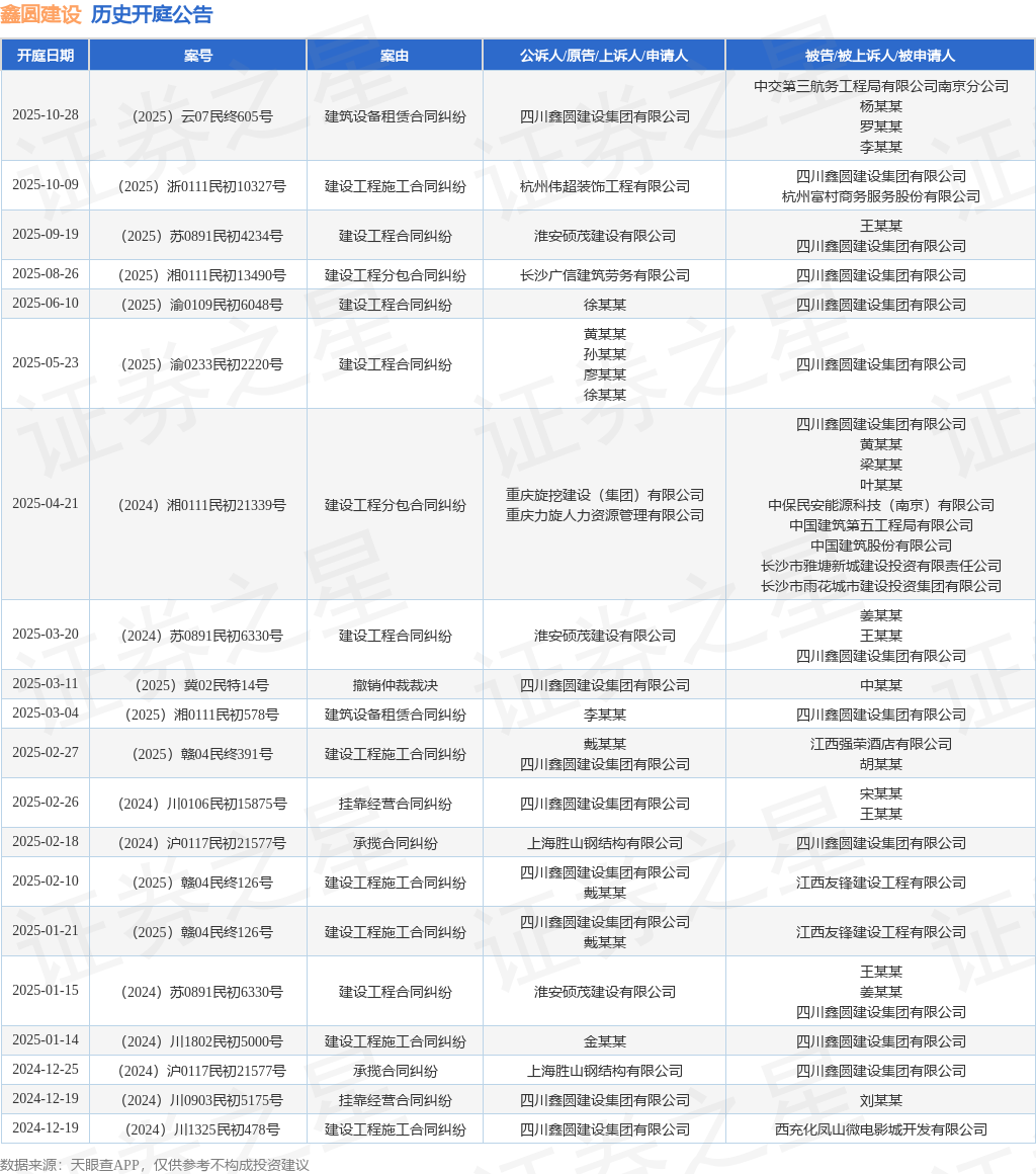案号:(2025)浙0111民初10327号根据统计,近一年内以四川鑫圆建设集团有限公司为当事人的历史开庭公告有37则,其中案由为“建设工程施工合同纠纷”的公告以8则居首,其次为“建设工程合同纠纷”有7则,“挂靠经营合同纠纷”有5则。历史开庭公告(前20条)如下: