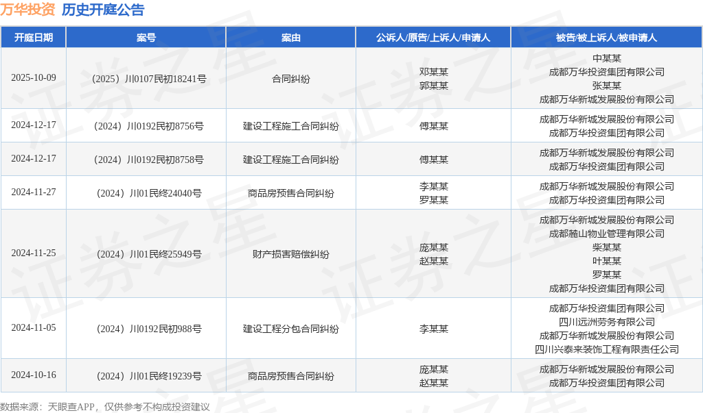 案号:(2025)川0107民初18241号根据统计,近一年内以成都万华投资集团有限公司为当事人的历史开庭公告有7则,其中案由为“商品房预售合同纠纷”的公告以2则居首,其次为“建设工程施工合同纠纷”有2则,“合同纠纷”有1则。历史开庭公告如下: