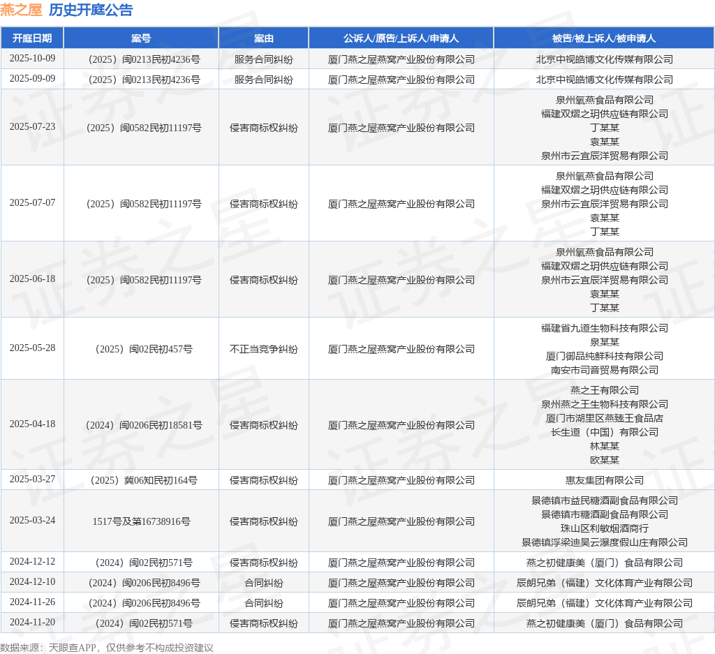 案号:(2025)闽0213民初4236号根据统计,近一年内以厦门燕之屋燕窝产业股份有限公司为当事人的历史开庭公告有13则,其中案由为“侵害商标权纠纷”的公告以8则居首,其次为“合同纠纷”有2则,“服务合同纠纷”有2则。历史开庭公告如下: