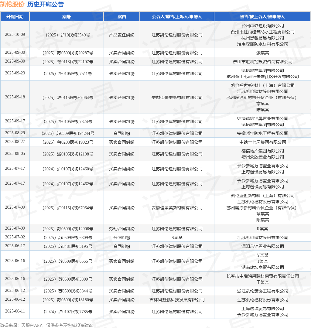 案号:(2025)浙10民终3549号根据统计,近一年内以江苏凯伦建材股份有限公司为当事人的历史开庭公告有78则,其中案由为“买卖合同纠纷”的公告以61则居首,其次为“劳动合同纠纷”有8则,“合同纠纷”有4则。历史开庭公告(前20条)如下: