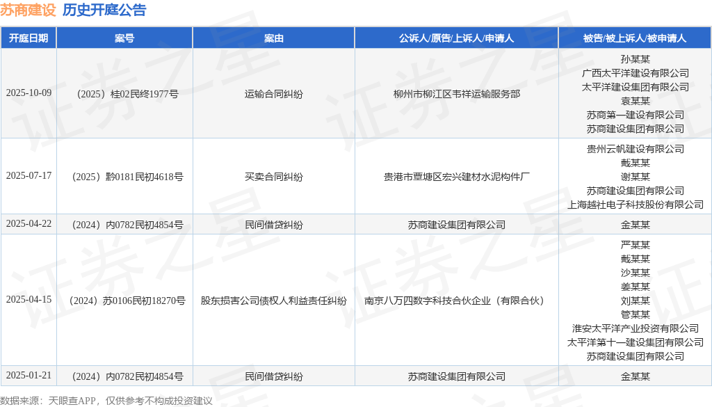 案号:(2025)桂02民终1977号根据统计,近一年内以苏商建设集团有限公司为当事人的历史开庭公告有5则,其中案由为“民间借贷纠纷”的公告以2则居首,其次为“买卖合同纠纷”有1则,“股东损害公司债权人利益责任纠纷”有1则。历史开庭公告如下: