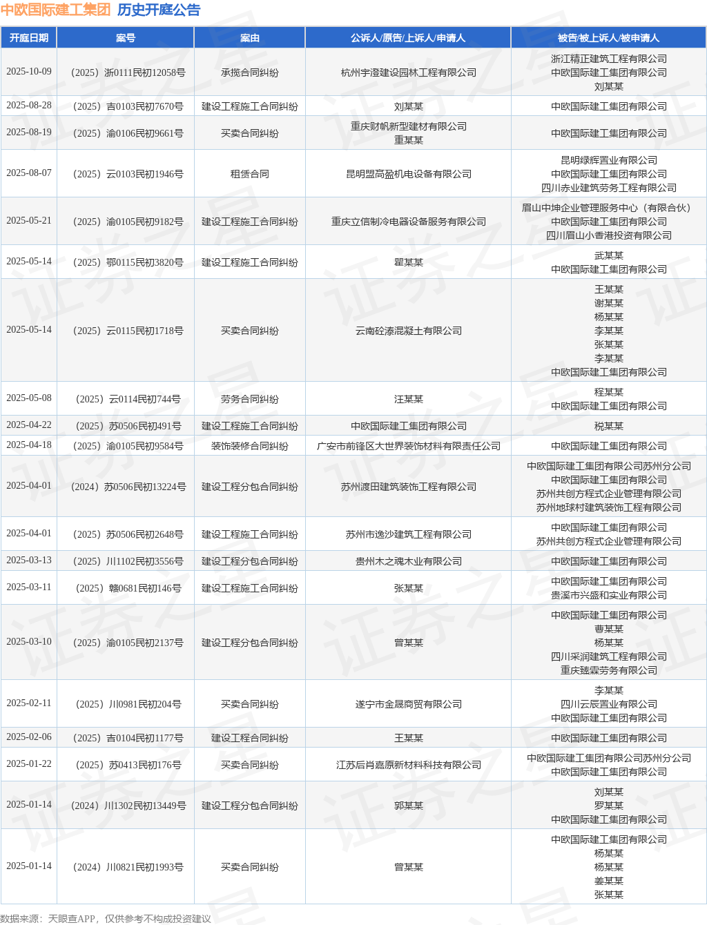 案号:(2025)浙0111民初12058号根据统计,近一年内以中欧国际建工集团有限公司为当事人的历史开庭公告有47则,其中案由为“买卖合同纠纷”的公告以14则居首,其次为“建设工程分包合同纠纷”有11则,“建设工程施工合同纠纷”有10则。历史开庭公告(前20条)如下: