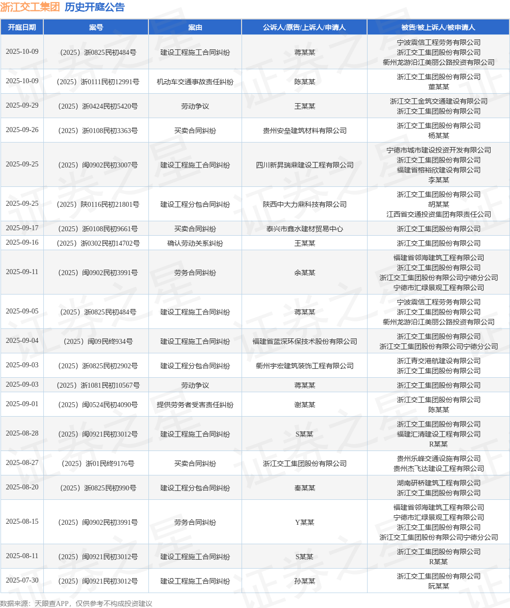 案号:(2025)浙0111民初12991号根据统计,近一年内以浙江交工集团股份有限公司为当事人的历史开庭公告有54则,其中案由为“建设工程施工合同纠纷”的公告以12则居首,其次为“买卖合同纠纷”有6则,“建设工程分包合同纠纷”有6则。历史开庭公告(前20条)如下:
