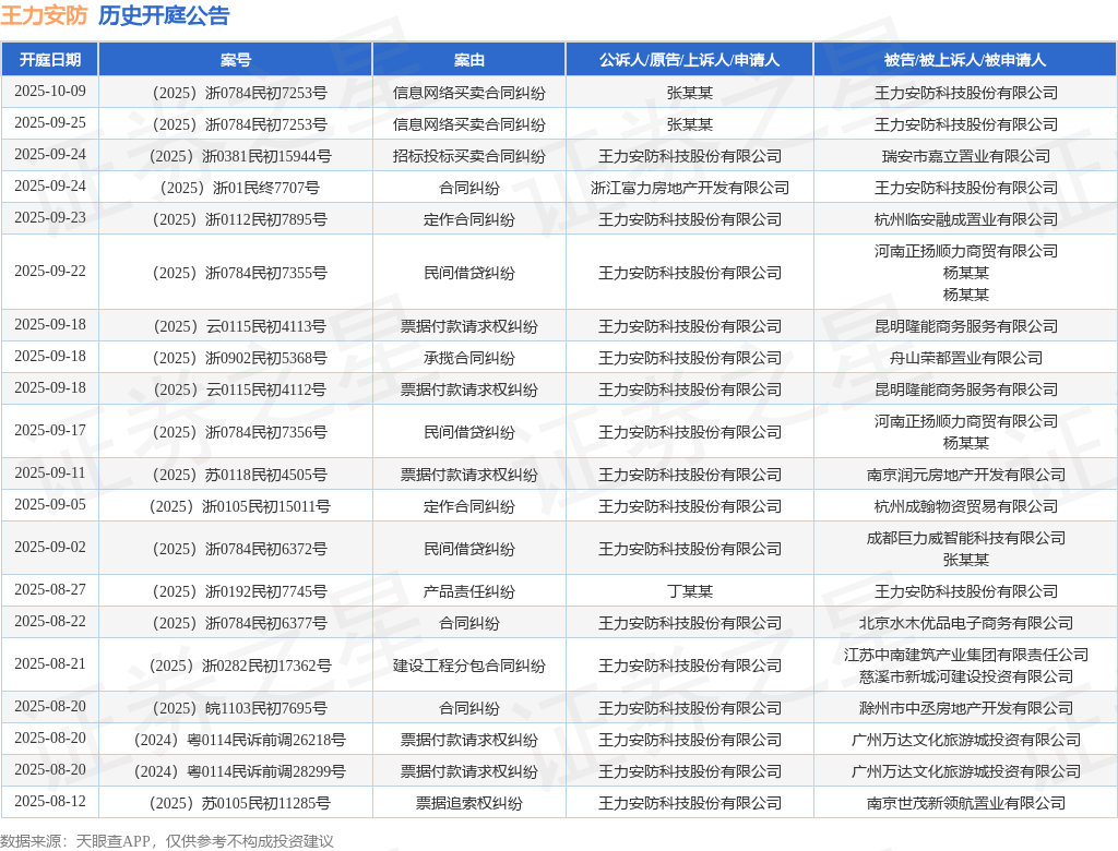 案号:(2025)浙0784民初7253号根据统计,近一年内以王力安防科技股份有限公司为当事人的历史开庭公告有123则,其中案由为“票据追索权纠纷”的公告以25则居首,其次为“买卖合同纠纷”有18则,“票据付款请求权纠纷”有16则。历史开庭公告(前20条)如下: