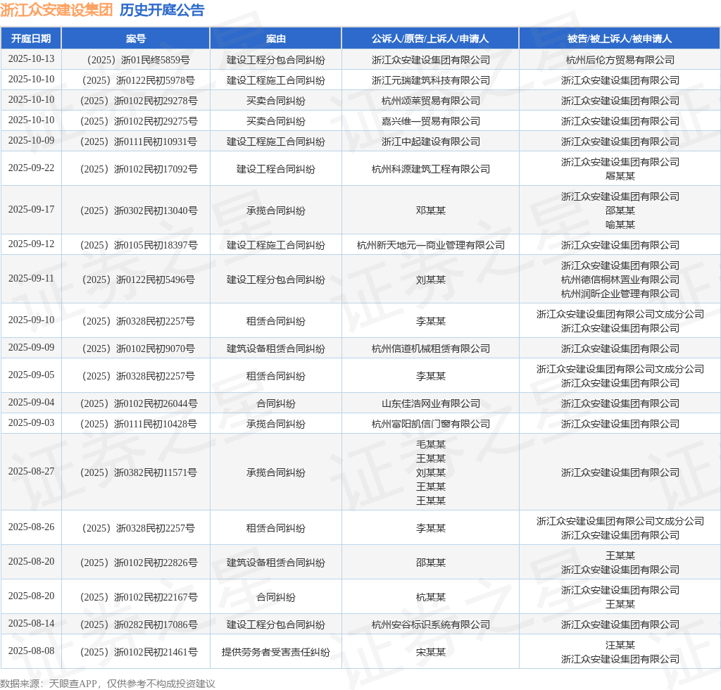案号:(2025)浙0111民初10931号根据统计,近一年内以浙江众安建设集团有限公司为当事人的历史开庭公告有71则,其中案由为“建设工程合同纠纷”的公告以13则居首,其次为“买卖合同纠纷”有9则,“建设工程分包合同纠纷”有9则。历史开庭公告(前20条)如下:
