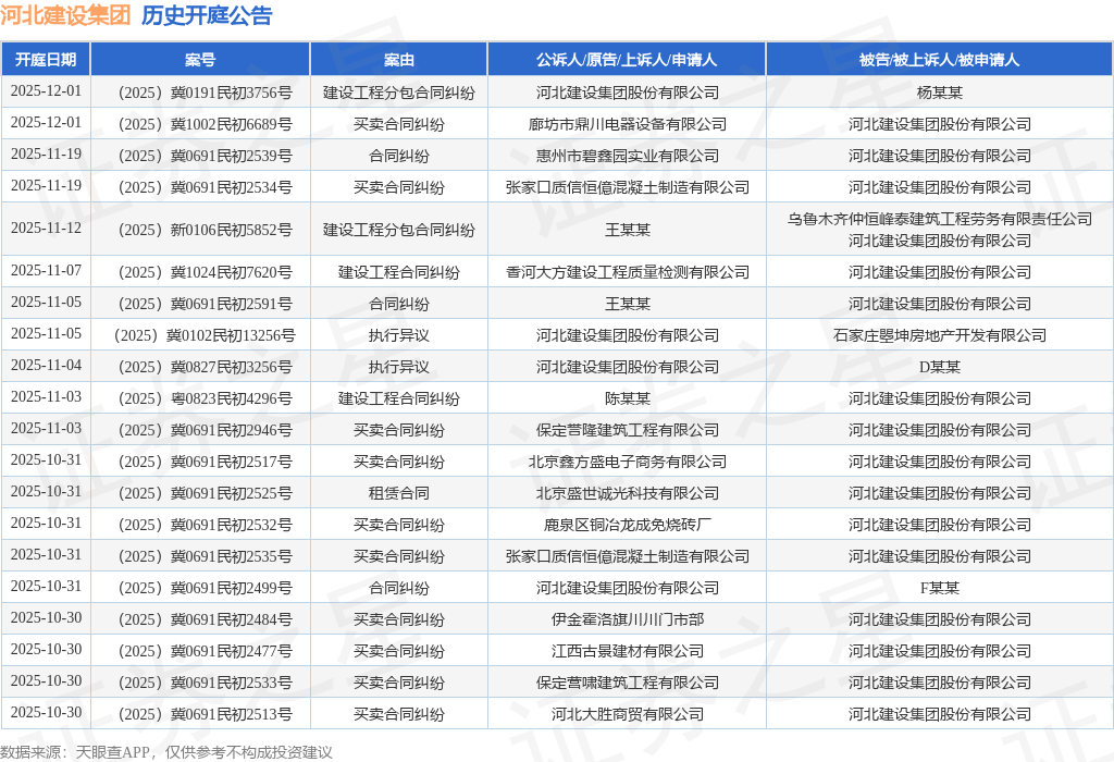 案号:(2025)冀0691民初2887号根据统计,近一年内以河北建设集团股份有限公司为当事人的历史开庭公告有1582则,其中案由为“买卖合同纠纷”的公告以639则居首,其次为“建设工程施工合同纠纷”有219则,“劳务合同纠纷”有114则。历史开庭公告(前20条)如下:
