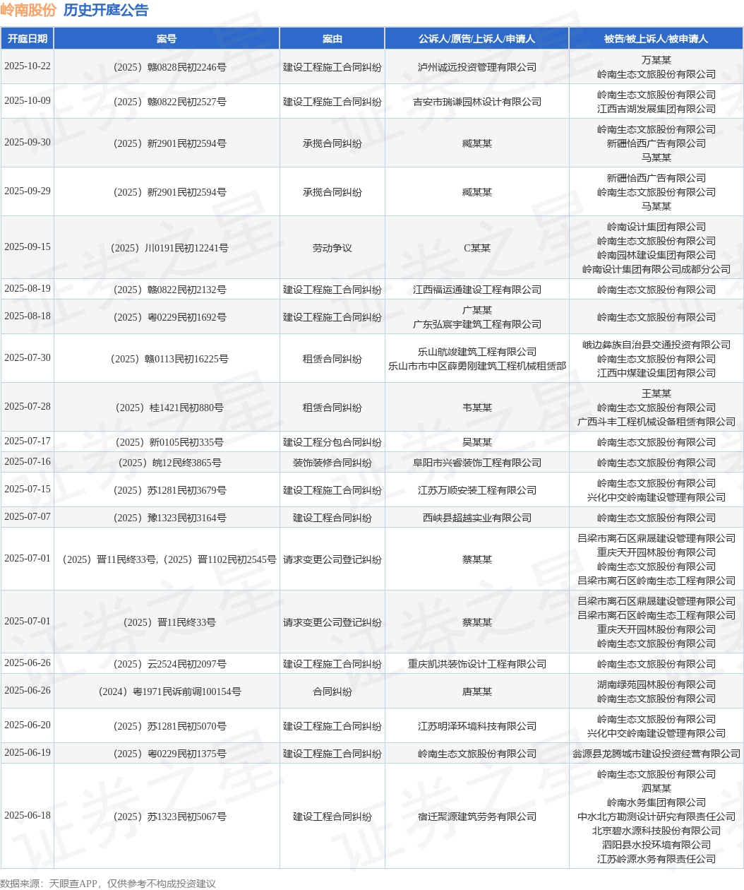 案号:(2025)赣0822民初2527号根据统计,近一年内以岭南生态文旅股份有限公司为当事人的历史开庭公告有103则,其中案由为“建设工程施工合同纠纷”的公告以35则居首,其次为“建设工程合同纠纷”有17则,“建设工程分包合同纠纷”有11则。历史开庭公告(前20条)如下:
