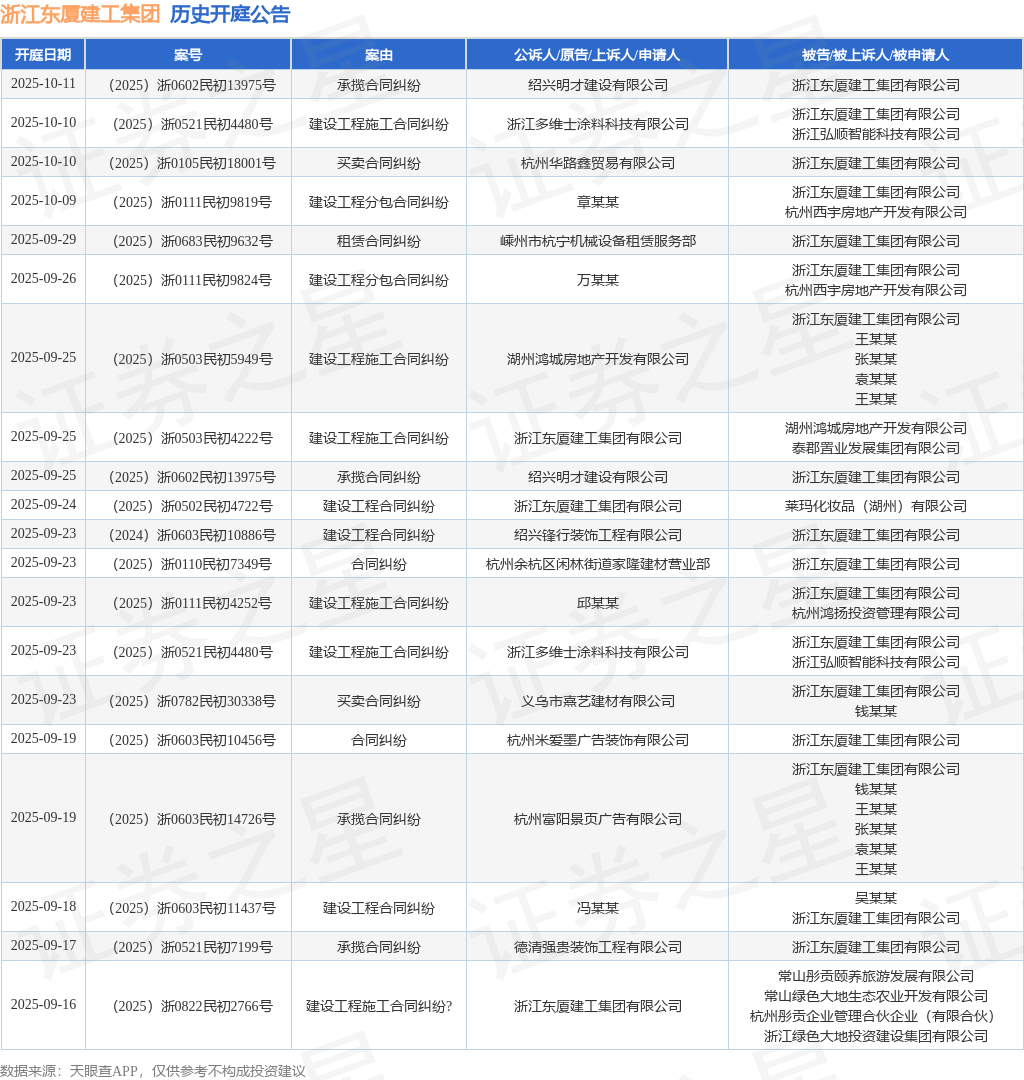 案号:(2025)浙0111民初9819号根据统计,近一年内以浙江东厦建工集团有限公司为当事人的历史开庭公告有120则,其中案由为“买卖合同纠纷”的公告以25则居首,其次为“建设工程施工合同纠纷”有21则,“合同纠纷”有14则。历史开庭公告(前20条)如下: